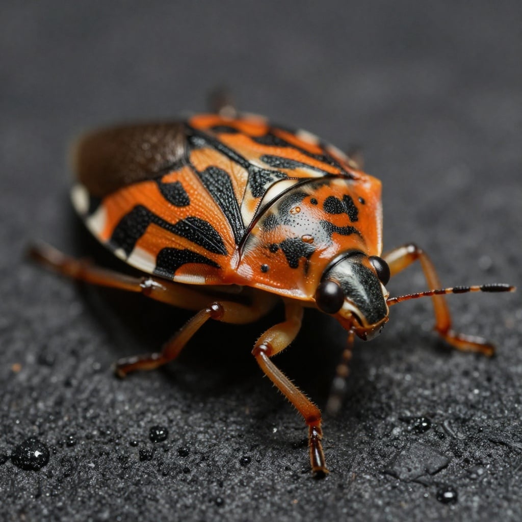 Close-up photo of a Bagrada bug with orange, black, and white pattern